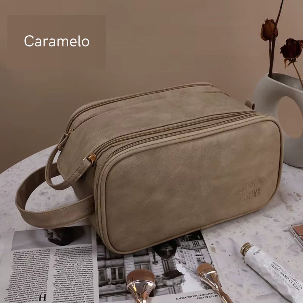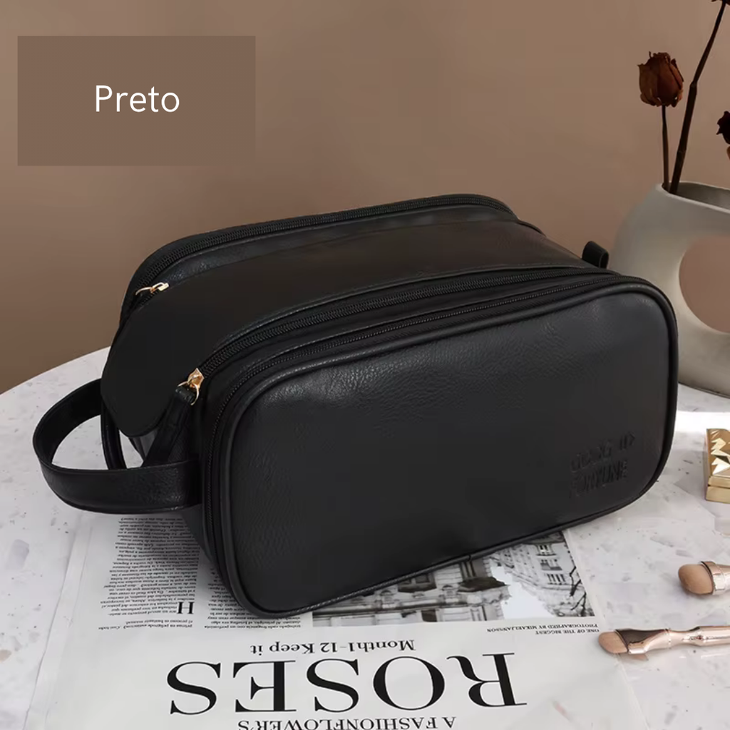 Com compartimentos inteligentes, estrutura rígida e acabamento sofisticado, ela guarda TUDO: skincare, perfumes, maquiagens, pincéis, acessórios e itens de higiene — sem amassar ou bagunçar.